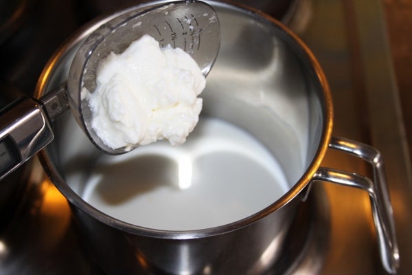 将牛奶与酸奶混合加热,搅拌至酸奶完全溶解。