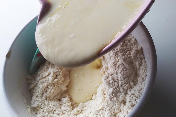 将湿性材料倒入干性材料碗中,用橡皮刮刀翻拌至无干粉即可,切勿过度搅拌。
