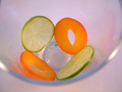 - 将青柠和熟透但硬实的杏子切成1/8英寸(3毫米)薄片,每杯需2片杏子和2片柠檬