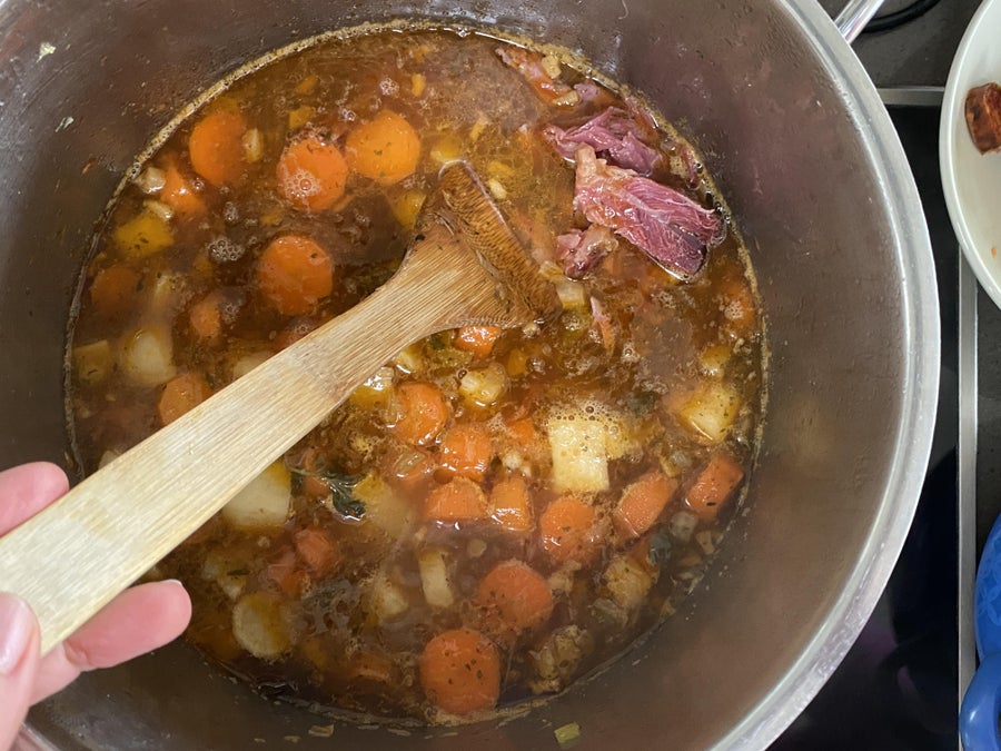 这里的人们普遍爱喝汤,一顿像样的周末餐食必定以汤品开场。今天我要分享的是一道传统辣味烟熏豆汤食谱。这道汤品风味浓郁,是我们全家的最爱,内含丰富蔬菜(以豆类为主),搭配烟熏猪肘、烟熏香肠和自制手捏面疙瘩。实际上,这道汤本身就能作为完整的一餐。