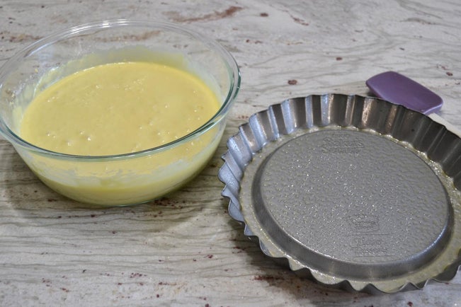 预热烤箱至350°F(175℃)。用不粘喷雾涂抹皇冠模具。将蛋糕粉倒入大碗,加入水、油和鸡蛋,中速搅打2分钟。将面糊均分到两个模具中,轻磕台面2次排出气泡。