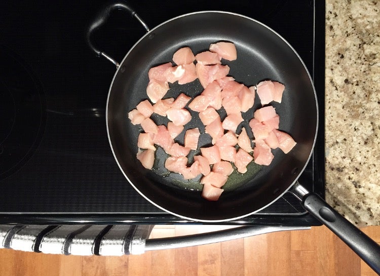 中火热锅倒橄榄油,放入鸡丁翻炒6-8分钟,中途翻面至完全熟透。