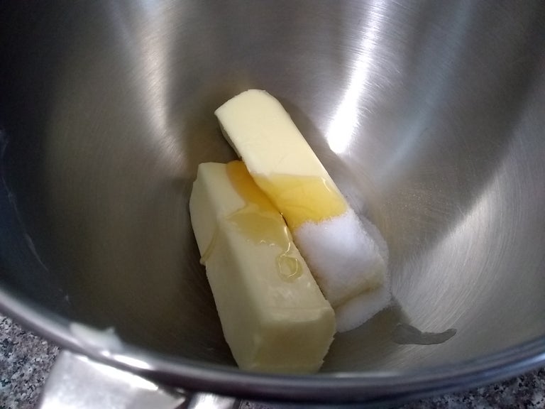 将黄油、糖和蜂蜜放入厨师机,搅拌至刚刚混合均匀(也可用碗和勺子手动搅拌)。