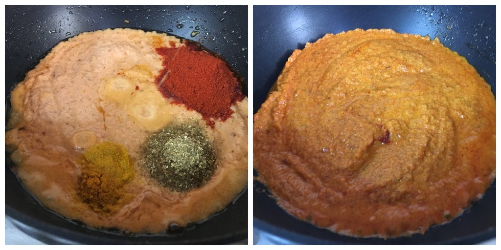 加入干香料粉(红辣椒粉、姜黄粉、芫荽粉)翻炒至出油。