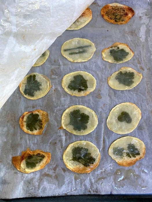 诀窍就是把土豆切成薄如蝉翼的片,在两层土豆片之间夹入香草叶(比如欧芹或其他薄叶片),然后进烤箱烘烤。就是这么简单,效果却惊艳四座。