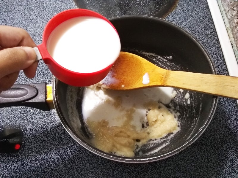 保持中火,边搅拌边缓缓加入冷牛奶,持续搅打至酱汁浓稠。理想状态应如浓奶油般柔滑,带有一定流动性