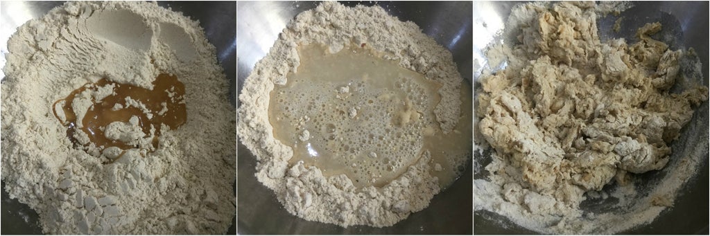 倒入发酵好的酵母液,搅拌成柔软面团。