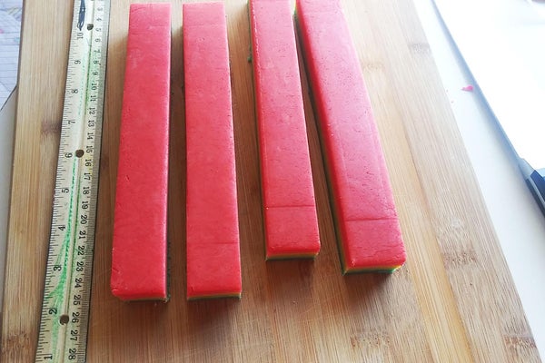 根据面片宽度切成2.7cm或3cm宽的长条,共需4条矩形面片。用锋利刀片切割。