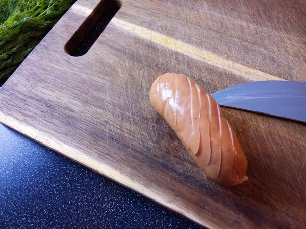 用锋利的小刀在香肠表面斜切深口,先朝一个方向切,再反向切割,形成菱形小方格纹路。
