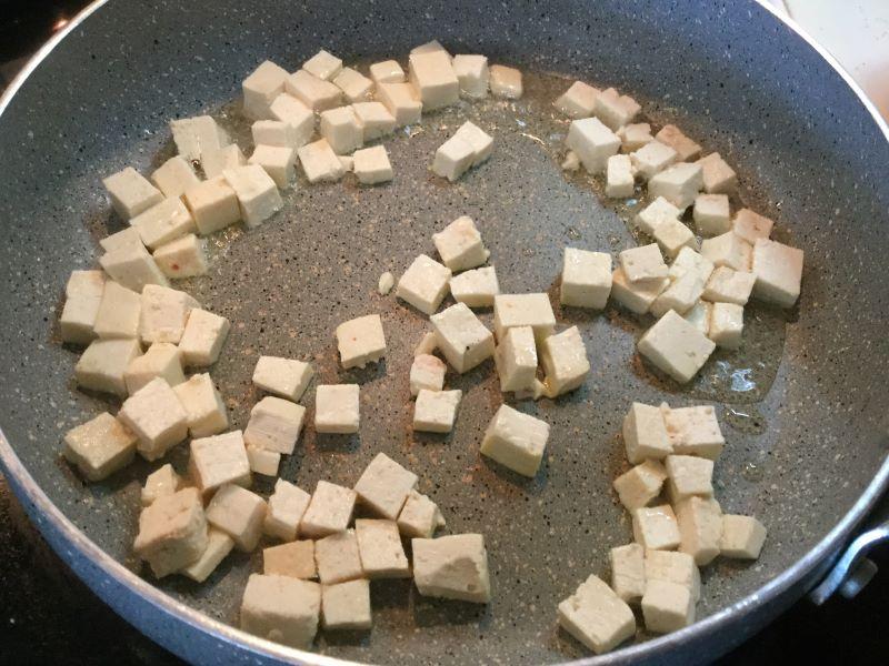 热3汤匙油,加入半份豆腐块,中火翻炒至表面金黄微脆,盛出备用。(此步骤可选,仅限喜欢脆豆腐口感者)