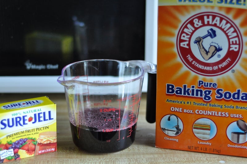 1. 准备8x8英寸方盘,铺上涂油铝箔备用。将葡萄汁、果胶粉和小苏打倒入大号厚底锅,中低火加热至沸腾后转小火保温。
