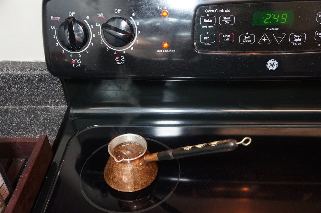 • 将土耳其咖啡壶(Cezve/Ibrik)置于炉灶上加热