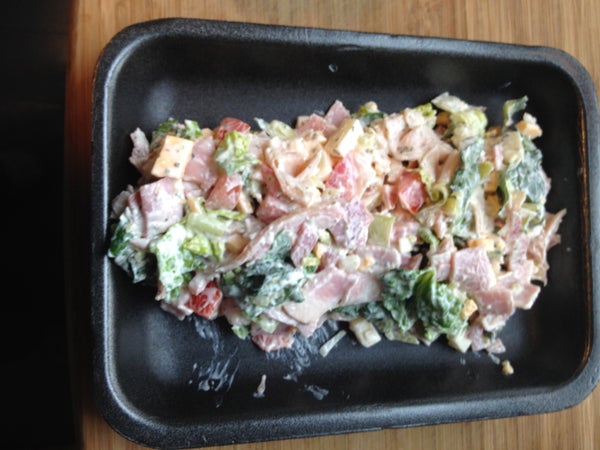 将洋葱细细剁碎,与生菜、番茄一起加入碗中。