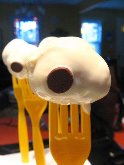 用塑料叉子刺穿甜甜圈洞,注意不要用棒棒糖棍(会导致甜甜圈旋转脱落)
