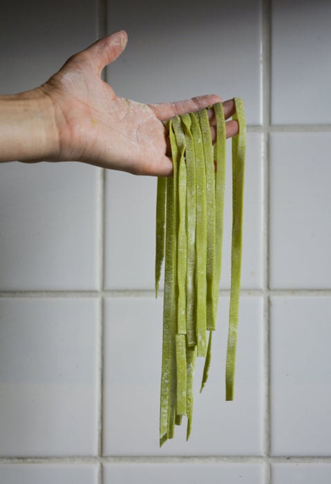 用您喜爱的方式烹调这款绿色意大利面。我的私房做法:橄榄油炒香洋葱大蒜,加少许白葡萄酒后放入面条,最后拌入1汤匙黄芥末和2汤匙奶油奶酪,淋上青柠汁,搭配新鲜芝麻菜和番茄块即可。