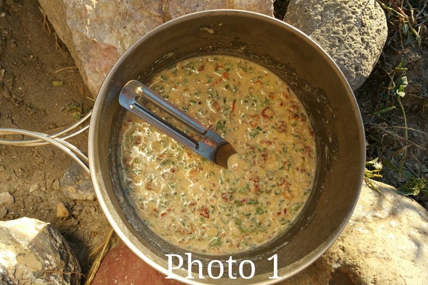 准备烹饪前20分钟开始调制面糊:打开纸袋将干料倒入容器,加入油和水混合(如图1)。如图2所示盖好容器静置20分钟,让脱水蔬菜充分吸水,同时确保鹰嘴豆粉完全饱和无结块。期间可准备生火或架设露营炉具。