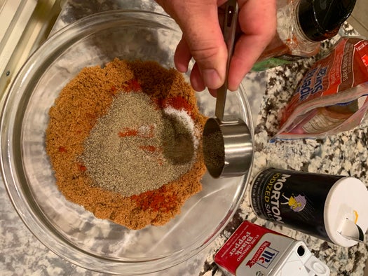 首先将所有干料混合在一个大玻璃碗中。红糖可能因受潮结块,需用叉子碾碎硬块。加入其余调料后彻底搅拌均匀。建议佩戴手套操作,以免烟熏红椒粉染黄双手。