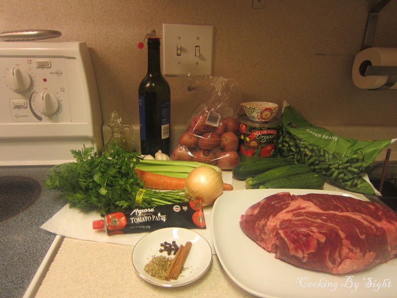 利用这个时间处理蔬菜:西葫芦对半切再切1/4英寸厚片,胡萝卜同样处理。西芹斜切(保持形状),土豆切四瓣(可保留外皮)。称量香料备用。