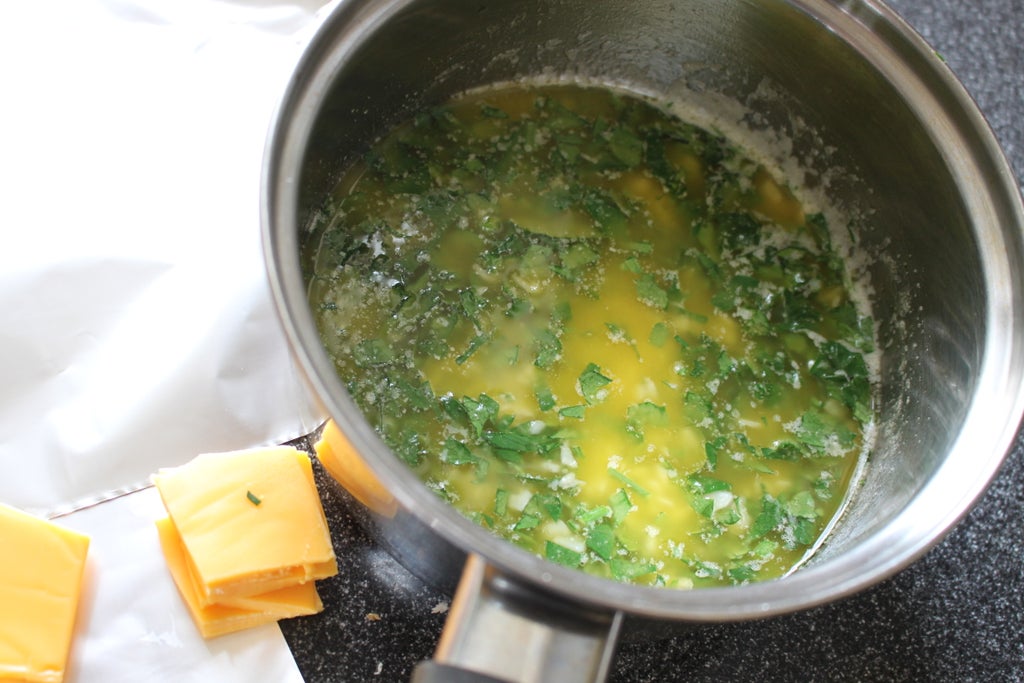 把芝士片切成小方块,塞入面包切口处。将黄油混合料均匀浇在切口上。