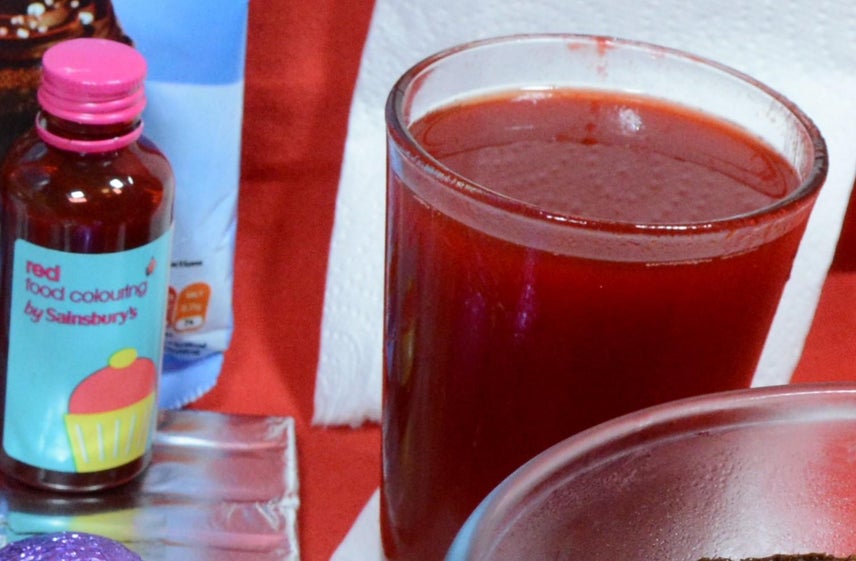 用红果汁制作"血液":取冷冻树莓樱桃加水、柠檬汁、红色食用色素和糖熬煮,过滤冷却后备用(约需1/2杯果汁)